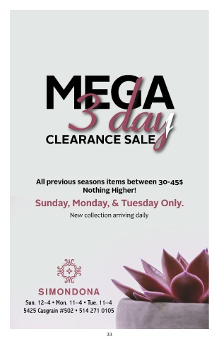 3 day MEGA CLEARANCE SALE All previous seasons items between 30-45$ Nothing Higher! Sunday, Monday, & Tuesday Only. New collection arriving daily Sun. 12–4 • Mon. 11–4 • Tue. 11–4 5425 Casgrain #502 • 514 271 0105 33