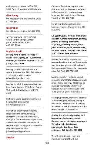 Well paid. Call Yitty Katina 514 970- budget? Call Devori Herzog 514 946