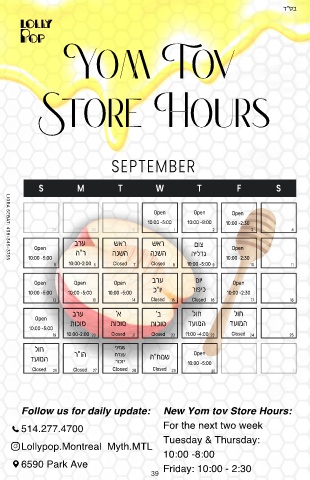 Follow us for daily update: New Yom tov Store Hours: