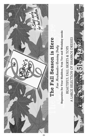 84 The Fall Season is Here New Merchandise Arriving Daily Separates for Your Shabbos, Yom Tov and Weekday needs BEAUTIFUL FALL SKIRTS & TOPS A LARGE SELECTION OF SHABBOS DRESSES