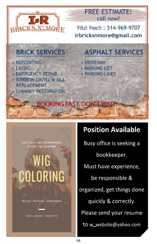 Position Available Busy office is seeking a bookkeeper. Must have experience, be responsible & organized, get things done quickly & correctly. Please send your resume to w website@yahoo.com 98