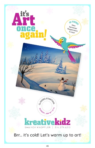 Art it’s once Semester HI THERE! New ! again Registration is now! CLASSES STARTING TH IY”H SUNDAY, JAN 16 SHAINDY KNOPFLER | 514.279.6213 Brr... it’s cold! Let’s warm up to art! 46