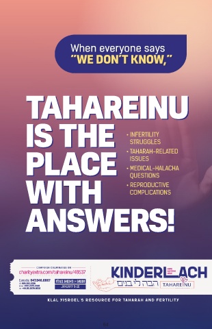 When everyone says “WE DON’T KNOW,” TAHAREINU IS THE • INFERTILITY STRUGGLES PLACE • TAHARAH-RELATED ISSUES • MEDICAL-HALACHA WITH • REPRODUCTIVE QUESTIONS COMPLICATIONS ANSWERS! charityextra.com/tahareinu/48537 Canada: 647.846.0867 64