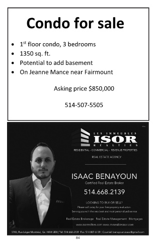 Condo for sale st • 1 floor condo, 3 bedrooms • 1350 sq. ft. • Potential to add basement • On Jeanne Mance near Fairmount Asking price $850,000 514-507-5505 84