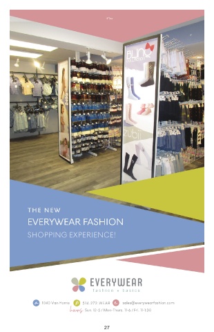 ד״סב THE NE W EVERYWEAR FASHION SHOPPING EXPERIENCE! e a 1040 Van Horne 514.272.WEAR sales@everywearfashion.com hours: Sun. 12-5 / Mon-Thurs. 11-6 / Fri. 11-1:30 27