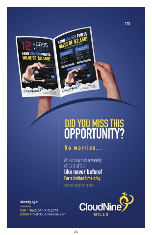 ד״סב DID YOU MISS THIS OPPORTUNITY? No worries... Amex now has a variety of card offers like never before! For a limited time only. see next page for details Mendy Igel Call • Text: 514.315.2273 Email: Info@cloudninemiles.com 24