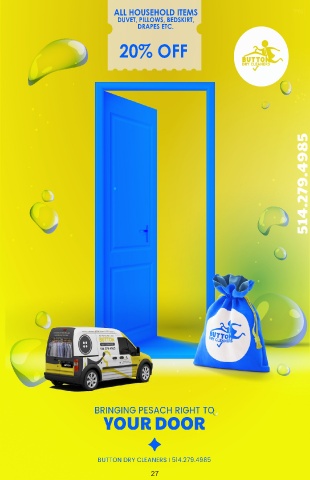 ALL HOUSEHOLD ITEMS ד״סב DUVET, PILLOWS, BEDSKIRT, DRAPES ETC. 20% OFF 514.279.4985 BRINGING PESACH RIGHT TO YOUR DOOR BUTTON DRY CLEANERS I 514.279.4985 27