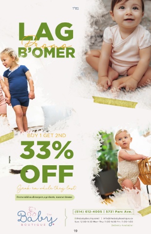 Promo valid on all rompers, 2 pc shorts, summer dresses (514) 612-4005 | 5731 Parc Ave. thebabyboutiquemtl | info@thebabyboutique.ca Sun: 12:00-5:30 Mon-Thu: 11:00-5:30 Fri: 11:00-1:00 Delivery Available! 19