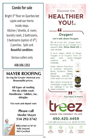 Condo for sale rd Bright 3 floor on Querbes bet Lajoie and van Horne. Inside steps. Kitchen / dinette, d. room, laundry room, 2 bathrooms, 3 bedrooms (option of 4 ). th 2 porches. Split unit. Beautiful condition. Serious callers only 438.506.1252 81