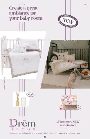 ד"סב Create a great ambiance for your baby room We now carry Crib sets We now carry Crib sets ...Many more NEW items in store 1036 Bernard 514-416-7701 Sun: 12PM - 5PM Mon - thu: 11AM - 5PM Fri: 11AM - 1PM 37