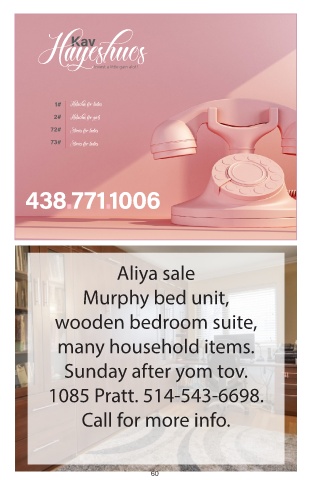 Hayeshuos Halachas for ladies Halachas for girls Stories for ladies Stories for ladies Aliya sale Murphy bed unit, wooden bedroom suite, many household items. Sunday after yom tov. 1085 Pratt. 514-543-6698. Call for more info. 60