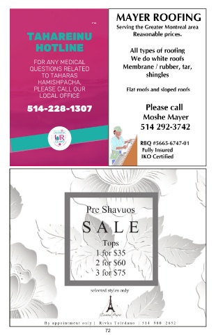 ד"סב TAHAREINU HOTLINE FOR ANY MEDICAL QUESTIONS RELATED TO TAHARAS HAMISHPACHA, PLEASE CALL OUR LOCAL OFFICE 514-228-1307 72