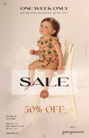 ONE WEEK ONLY S TAR TING SUND AY , JUNE 19 TH INFO@MYNTDESIGN.COM SALE SS22 50% OFF 5603 PARC AVE 514.447.8880 SUN 12:00 - 5:00 MON - THURS 11:00 - 5:30 FRI 10:30 - 1:00 BY POMPOMME.COM 13