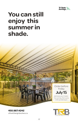 You can still enjoy this summer in shade. Order before friday July 15 and enjoy your hassle- free awning, that easily rolls up and down! 450.987.4242 office@therightbrothers.ca CONSTR UCTION 17