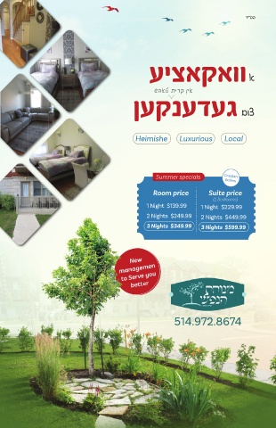 " עיצאקאוו ןעקנעדעג Heimishe Luxurious Local Summer specials Cnadian Dollars Room price Suite price (2 Bedrooms) 1 Night $139.99 1 Night $229.99 2 Nights $249.99 2 Nights $449.99 3 Nights $349.99 3 Nights $599.99 514.972.8674 11