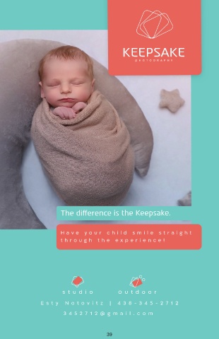 KEEPSAKE p The di erence is the Keepsake. H a v e y our child smile s tr aigh t thr ou gh the e xp erienc e! s tudio ut do or E s t y N o t o vit z | 4 3 8- 3 4 5 - 2 7 12 3 4 5 2 7 12@g m ail.c om 39