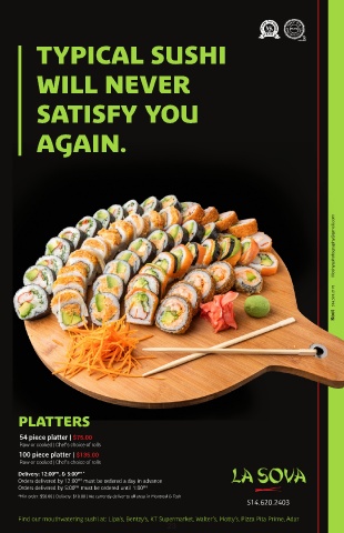 Find our mouthwatering sushi at: Lipa’s, Bentzy’s, KT Supermarket, Walter’s, Motty’s, Pizza Pita Prime, Adar