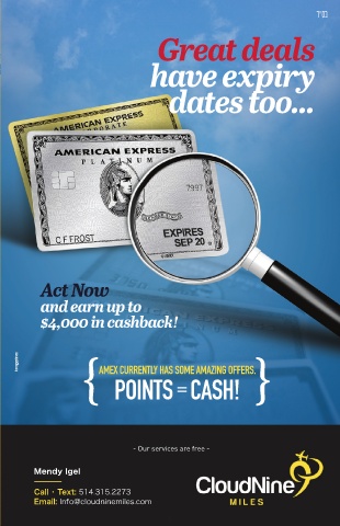 ד״סב Great deals have expiry dates too... Act Now and earn up to $4,000 in cashback! { AMEX CURRENTLY HAS SOME AMAZING OFFERS. { POINTS CASH! = - Our services are free - Mendy Igel Call • Text: 514.315.2273 Email: Info@cloudninemiles.com 3