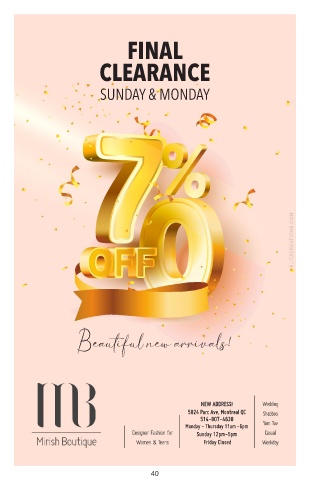 FINAL CLEARANCE SUNDAY & MONDAY Beautiful new arrivals! NEW ADDRESS! 5824 Parc Ave, Montreal QC 514-807-4638 Monday - Thursday 11am -6pm Sunday 12pm-5pm Friday Closed 40