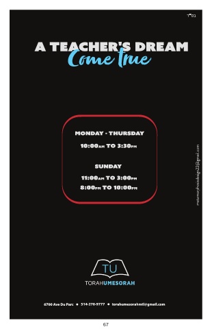 ” a teacher's dream Monday - thursday metamorphosisdesign22@gmail.com 10:00am to 3:30pm sunday 11:00am to 3:00pm 8:00pm to 10:00pm 6700 Ave Du Parc 514-270-9777 torahumesorahmtl@gmail.com 67