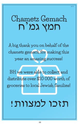 BS’D Chametz Gemach ח’מג ץמח A big thank you on behalf of the chametz gemach for making this year an amazing success! BH we were able to collect and distribute over $10 000 worth of groceries to local Jewish families! !תווצמל וכזת 68