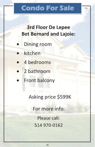 F o d o r l e a S n o C Condo For Sale ד"סב 3rd Floor De Lepee Bet Bernard and Lajoie: • Dining room • kitchen • 4 bedrooms • 2 bathroom • Front balcony Asking price $599K For more info. Please call: 514 970-0162 36