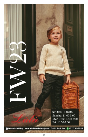 FW23 STORE HOURS Sunday: 11:00-5:00 Mon-Thu: 10:30-6:00 Fri: 10:30-2:00 lulukidsclothing www.lulukidsclothing.com 5421 Park Ave 877-799-5858 16