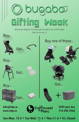 Gifting Week With every Bugaboo Purchase get free gifts! Up to $274 Value Offer Expires Sep 19 Buy... Buy one of these... Get... Buy... Get... Buy... Get... Get... 72
