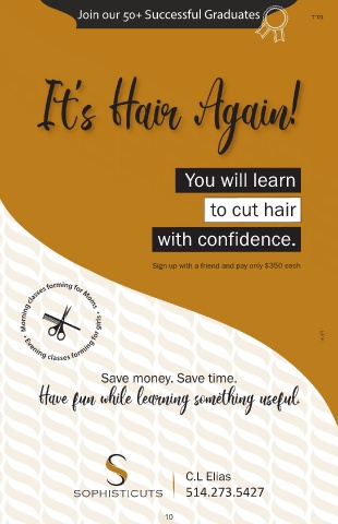 Join our 50+ Successful Graduates “ You will learn to cut hair with confidence. Sign up with a friend and pay only $350 each Morning classes forming for Moms • Evening classes forming for girls • C.L Elias SOPHISTICUTS 514.273.5427 10
