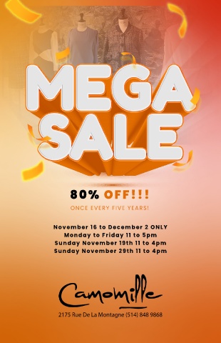 MEGAMEGA S SALEALE 80% OFF!!! ONCE EVERY FIVE YEARS! November 16 to December 2 ONLY Monday to Friday 11 to 5pm Sunday November 19th 11 to 4pm Sunday November 29th 11 to 4pm 2175 Rue De La Montagne (514) 848 9868