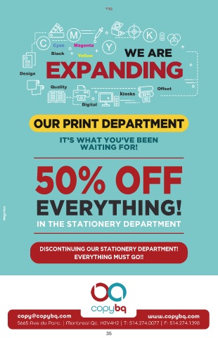 ד״סב OUR PRINT DEPARTMENT IT’S WHAT YOU’VE BEEN WAITING FOR! 50% OFF EVERYTHING! IN THE STATIONERY DEPARTMENT DISCONTINUING OUR STATIONERY DEPARTMENT! EVERYTHING MUST GO!! 35