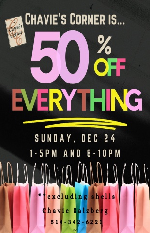 Chavie’s Corner is... 50 O F F % EVERYTHIN G S U N D A Y , D E C 2 4 1 - 5 P M A N D 8 - 1 0 P M * * e x c l u d i n g s h e l l s C h a v i e S a l z b e r g 5 1 4 - 3 4 2 - 6 2 2 1 32