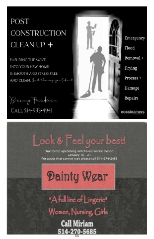 Due to the upcoming simcha we will be closed January 10 - 21 For appts that cannot wait please call 514-274-2483 54