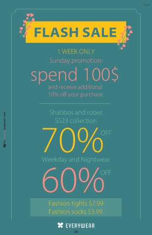 FLASH SALE 1 WEEK ONLY Sunday promotion: spend 100$ and receive additional 10% o your purchase Shabbos and robes dozigzag@gmail.com 70% SS23 collection OFF Weekday and Nightwear 60% OFF Fashion tights $7.99 Fashion socks $3.99 29