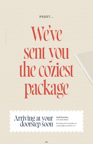 PS S ST... We’ve This year’s book is one you won’t want to miss. sent you the coziest package Arriving at your Call/Text/Fax 514.658.8899 doorstep soon boneiauctioncanada.ca orders@boneiolam.ca 44