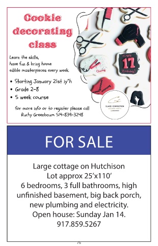 FOR SALE Large cottage on Hutchison Lot approx 25’x110’ 6 bedrooms, 3 full bathrooms, high un nished basement, big back porch, new plumbing and electricity. Open house: Sunday Jan 14. 917.859.5267 75