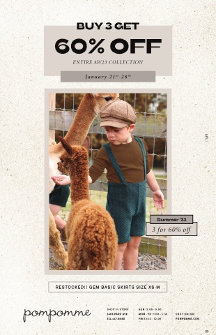 BUY 3 GET 60% OFF Summer ’23 RESTOCKED!! GEM BASIC SKIRTS SIZE XS-M SHOP IN STORE SUN 12:00 - 5:00 5603 PARC AVE MON - TH 11:00 - 5:30 SHOP ONLINE 514.447.8880 FRI 10:30 - 12:00 POMPOMME.COM