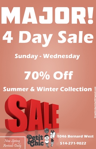 MAJOR! 4 Day Sale Sunday - Wednesday 70% Off Summer & Winter Collection Graphicsbyricky28@gmail.com 1046 Bernard West New Spring Arrivals Daily 16 514-271-9022