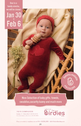 Due to a family simcha, we will be closed Jan 30 - Feb 6 Delivery available 438-519-2899 Nice Selection of baby gifts. towels, swaddles,security bunny and much more 21