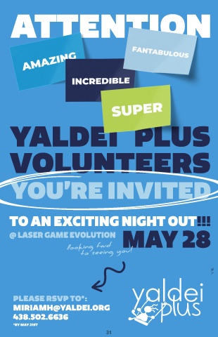 ATTENTION YALDEI PLUS VOLUNTEERS YOU’RE INVITED TO AN EXCITING NIGHT OUT!!! @ LASER GAME EVOLUTION MAY 28 looking fwd to seeing you! PLEASE RSVP TO*: S MIRIAMH@YALDEI.ORG 438.502.6636 *BY MAY 21ST 31