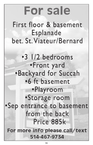 First floor & basement Esplanade bet. St. Viateur/Bernard •3 1/2 bedrooms •Front yard •Backyard for Succah •6 ft basement •6 ft basement •Playroom •Storage room •Sep entrance to basement from the back Price 885k 56