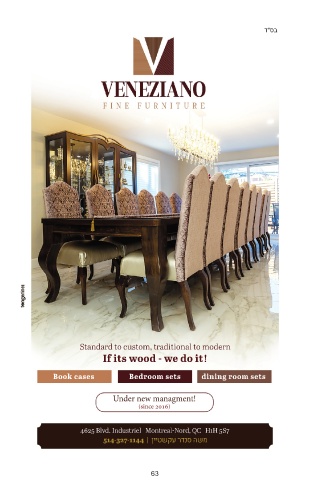 ד״סב Standard to custom, traditional to modern If its wood - we do it! Book cases Bedroom sets dining room sets Under new managment! (since 2016) 4625 Blvd. Industriel Montreal-Nord, QC H1H 5S7 514-327-1144 | ןייטשקע רדנס השמ 63