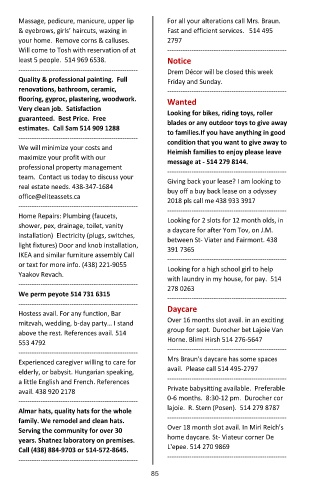 Massage, pedicure, manicure, upper lip For all your alterations call Mrs. Braun.