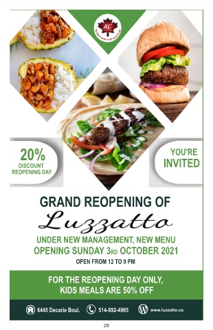 20% YOU'RE DISCOUNT INVITED REOPENING DAY GRAND REOPENING OF UNDER NEW MANAGEMENT, NEW MENU OPENING SUNDAY 3RD OCTOBER 2021 OPEN FROM 12 TO 9 PM FOR THE REOPENING DAY ONLY, KIDS MEALS ARE 50% OFF 6445 Decarie Boul. 514-892-4965 www.luzzatto.ca 29