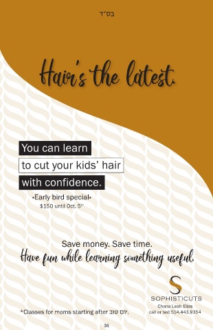 “ You can learn to cut your kids’ hair with confidence. ▪Early bird special▪ $150 until Oct. 5 th SOPHISTICUTS Chana Leah Elias *Classes for moms starting after . call or text 514.443.9354 36