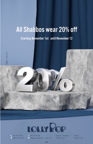 All Shabbos wear 20% off Starting November 1st until November 12 23