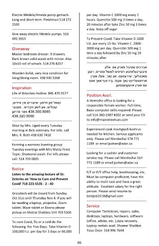 morning in Belz seminary. For info. call Experienced cook mashgiach kashrus