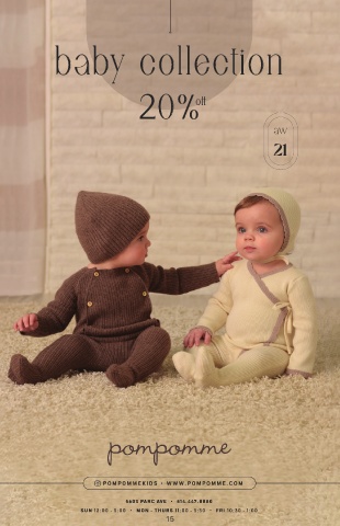 baby collection 20% off aw 21 INFO@MYNTDESIGN.COM POMPOMMEKIDS • W W W.POMPOMME.COM 5603 PARC AVE • 514.447.8880 SUN 12:00 - 5:00 • MON - THURS 11:00 - 5:30 • FRI 10:30 - 1:00 15