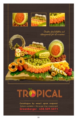 Creative fruit platters and arrangements for all occasions C at alo gue b y email up o n request Delivery available • We accept Visa • mastercard Greenberger 438.509.5071 59