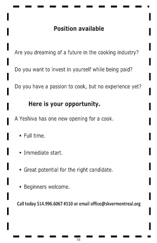 A Yeshiva has one new opening for a cook.